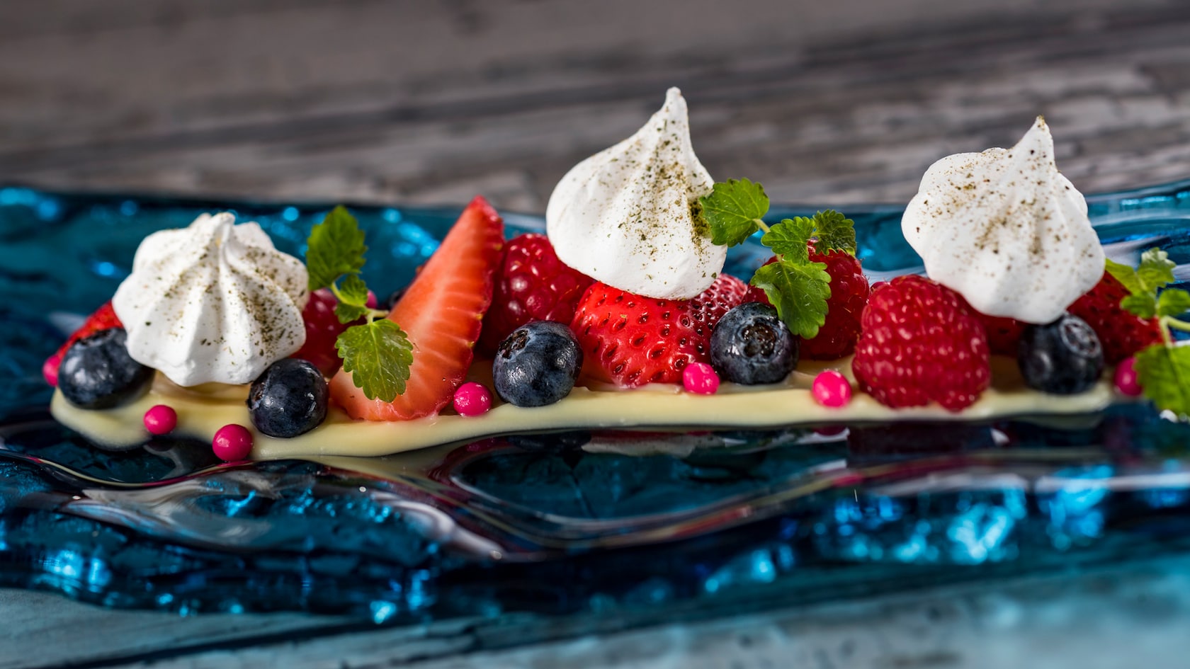 • Deconstructed Pavlova with Pastry Cream, Citrus-macerated Berries and Lemon Myrtle Meringue (gluten/wheat-friendly)