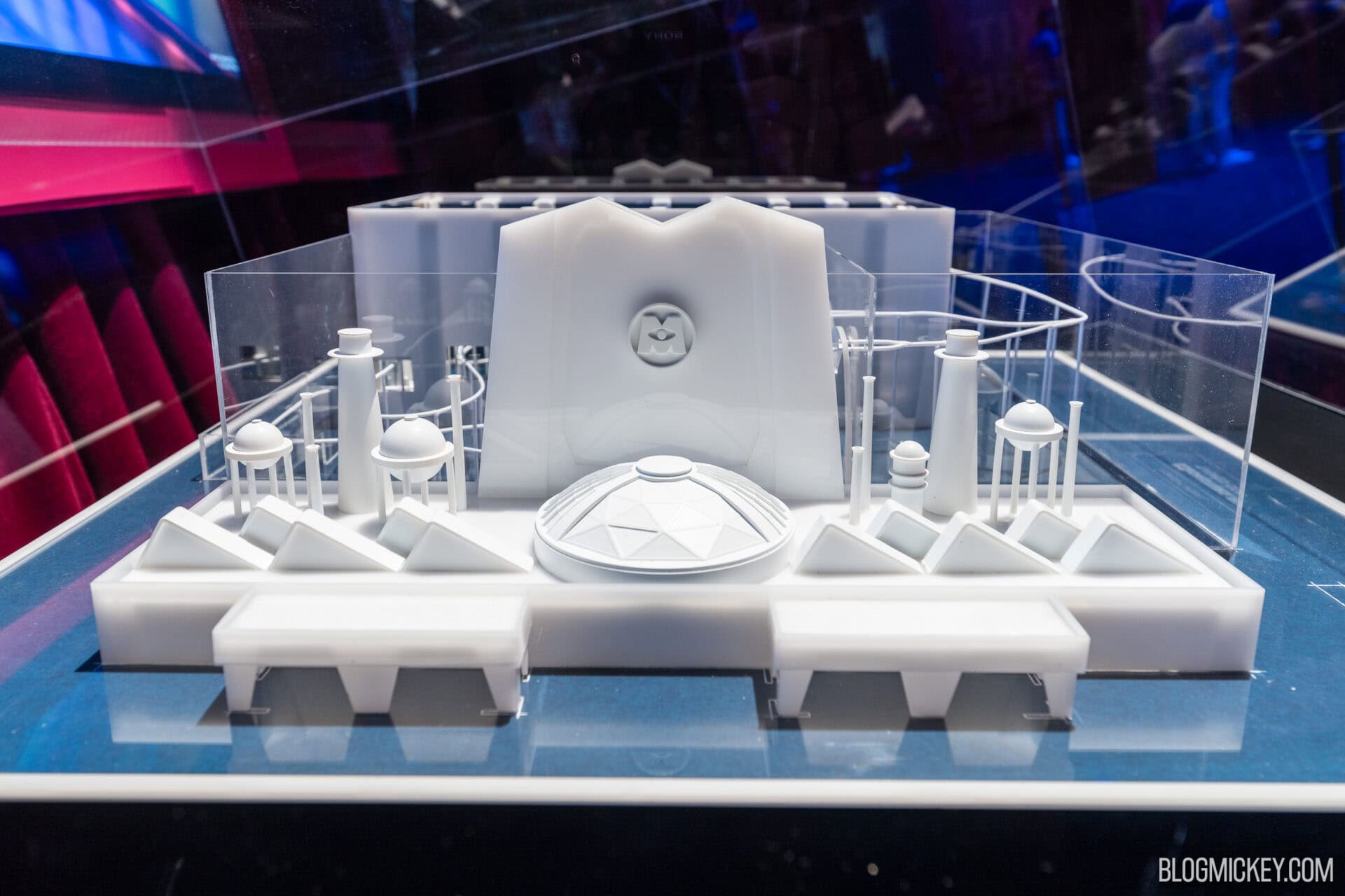 The model is a basic white 3D print of the show building facade and two massive show rooms. It certainly doesn’t offer any real clues as to where in Disney’s Hollywood Studios the roller coaster will be located. In fact, the box-shaped building can likely be placed just about anywhere. A TV above the model cycles through the concept art seen earlier in this article.