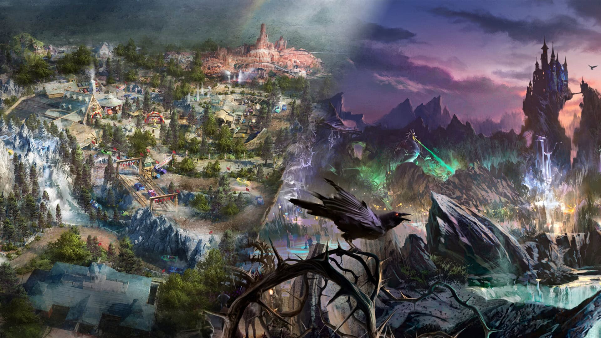 Going back to the premise of this article, the Villains Land project is much further along than previously thought. When presented in 2022, Villains Land was just about as Blue Sky as you could get. A shadowy silhouette of Dragon Maleficent sat off in the distance in the artwork shown below, and while the crowd erupted at the announcement, it was clear that the project was very much in its infancy.