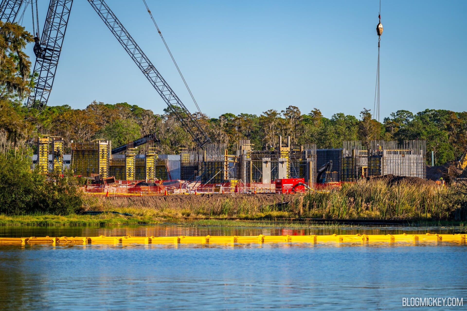 A second vantage point closer to the Fort Wilderness dock shows other walls and columns under construction on the northwest side of the site.