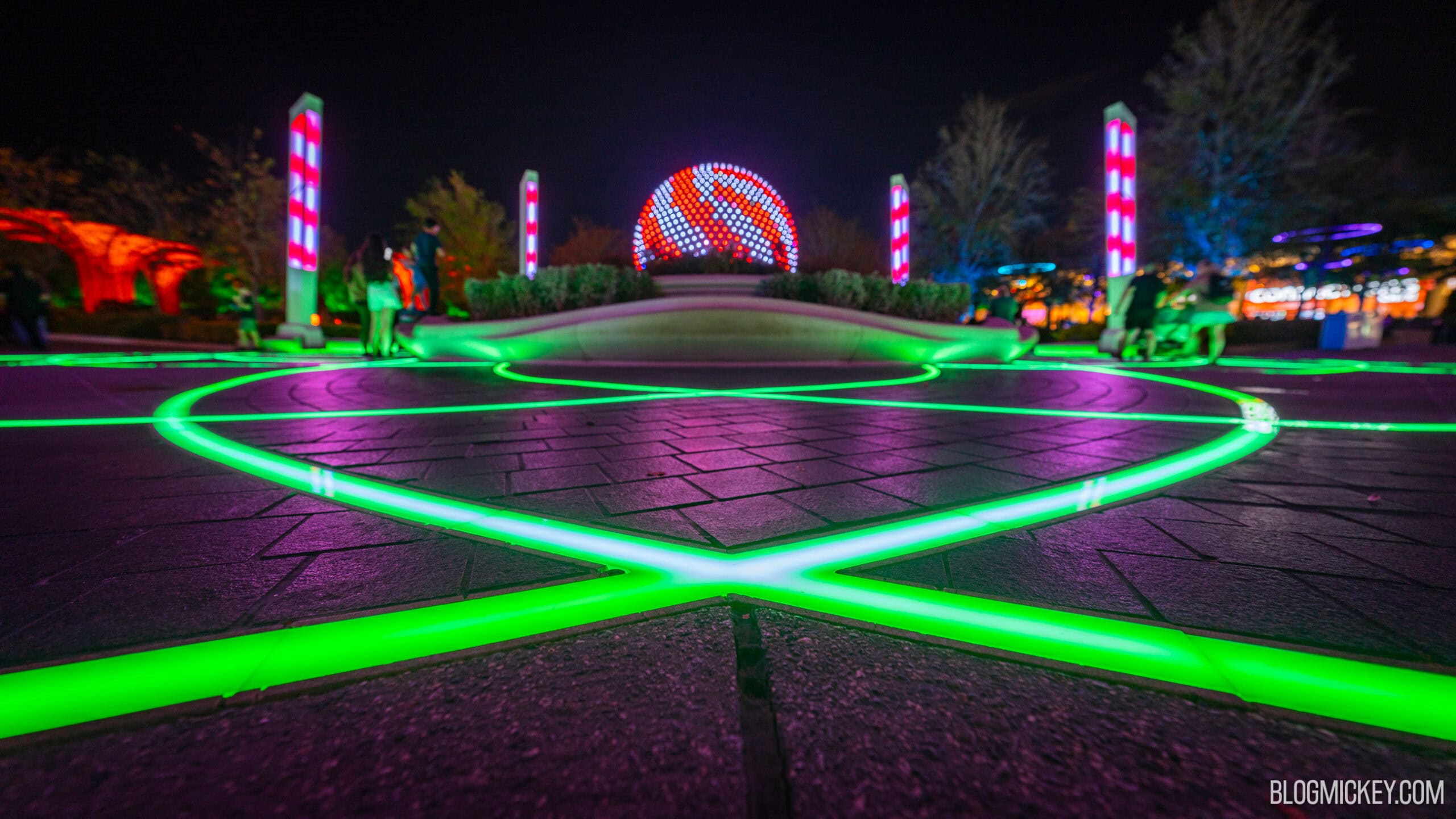Walt Disney World has finally restored the in-ground lighting effects in EPCOT’s World Celebration Gardens after nearly a year of struggles. While visiting EPCOT last night, we noticed that the rings were finally all completely illuminated, something that wasn’t even working during the first week that the lights debuted last year. Walt Disney World still has a little bit of work to do before we can declare that the lights are fully working again though, with some of the Spaceship Earth Points of Light shows not yet fully programmed with the in-ground lights. That said, it’s wonderful to see Disney actually fix the lights themselves as we await programming. Here’s a closer look!