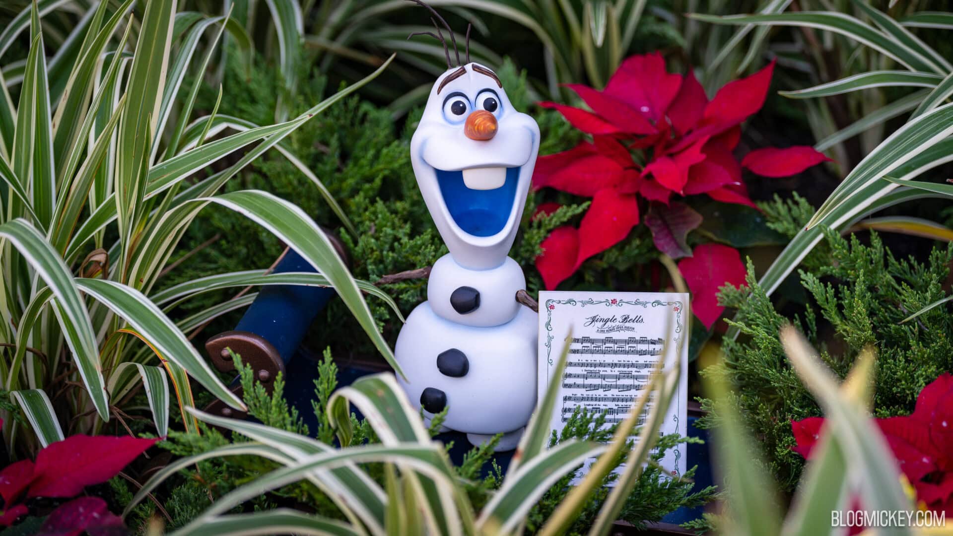 There is only one Olaf to find in The American Adventure this year thanks to the opening of CommuniCore Hall, but let’s not get ahead of ourselves. The first and perhaps best place to look for a holiday tradition is next to a giant Christmas tree, and that’s where you’ll find Olaf along with sheet music for “Jingle Bells”.