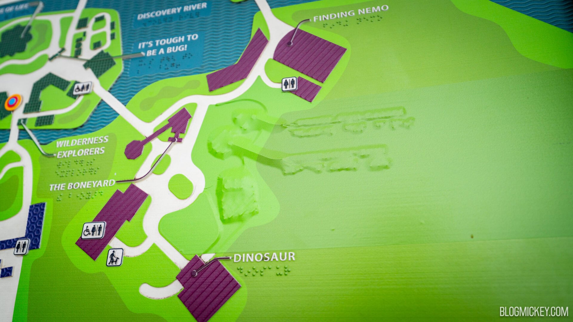 Here’s a look at the sticker, placed over the closed section of Dino-Rama on the Braille Map. I can not read Braille, so I’m not sure if the sticker is sufficient enough to indicate to guests that the area is not actually open. I’d imagine that the Braille would ideally be completely removed to indicate that the attractions and experiences are no longer available.