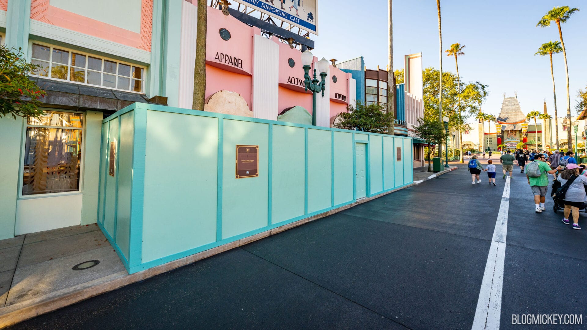 In September 2022, a facade along Hollywood Boulevard was damaged at Disney’s Hollywood Studios. The part of the facade that was damaged was a doorway leading into the Keystone Clothiers gift shop along the main walkway at the park. Walt Disney World attempted some early repairs, but the broken facade has been left, unfixed, for years…until now.