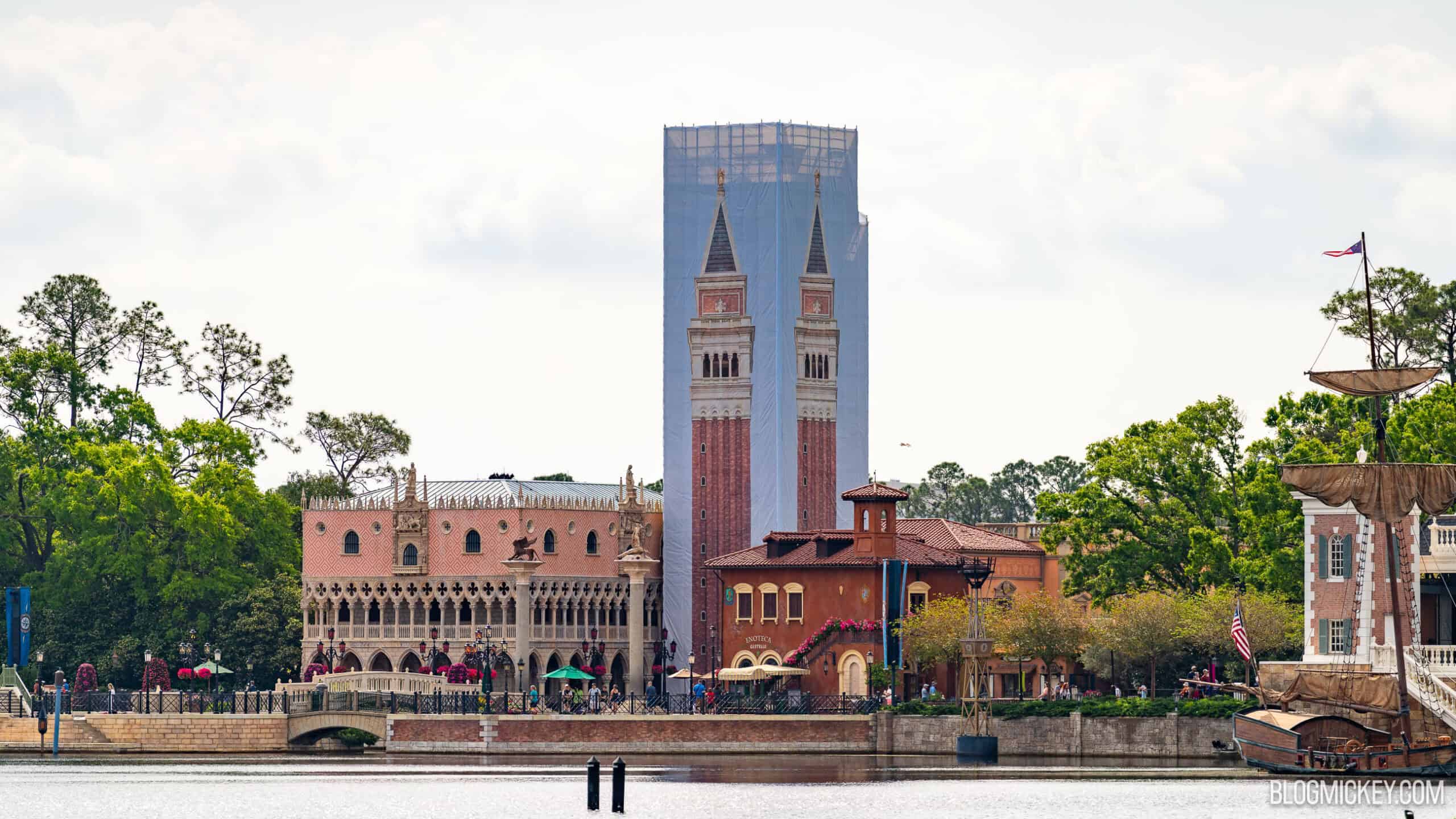 Themed Scrim Engulfs St Mark’s Campanile Bell Tower During Italy Pavilion Refurbishment at EPCOT