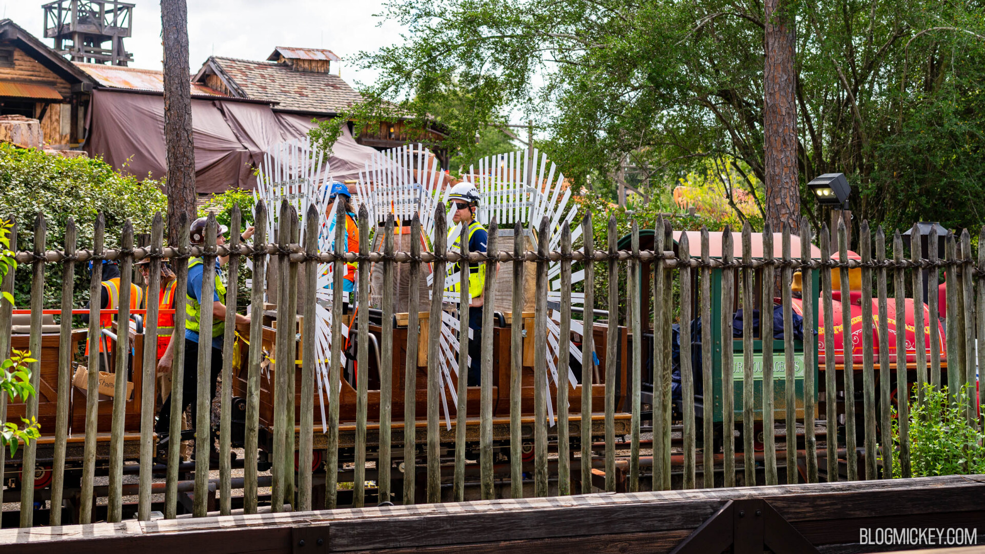 And here’s a look at the Big Thunder Mountain Railroad ride vehicle being prepared for its own pull-through test. Crews were working on installing the envelope test device when we visited this morning.