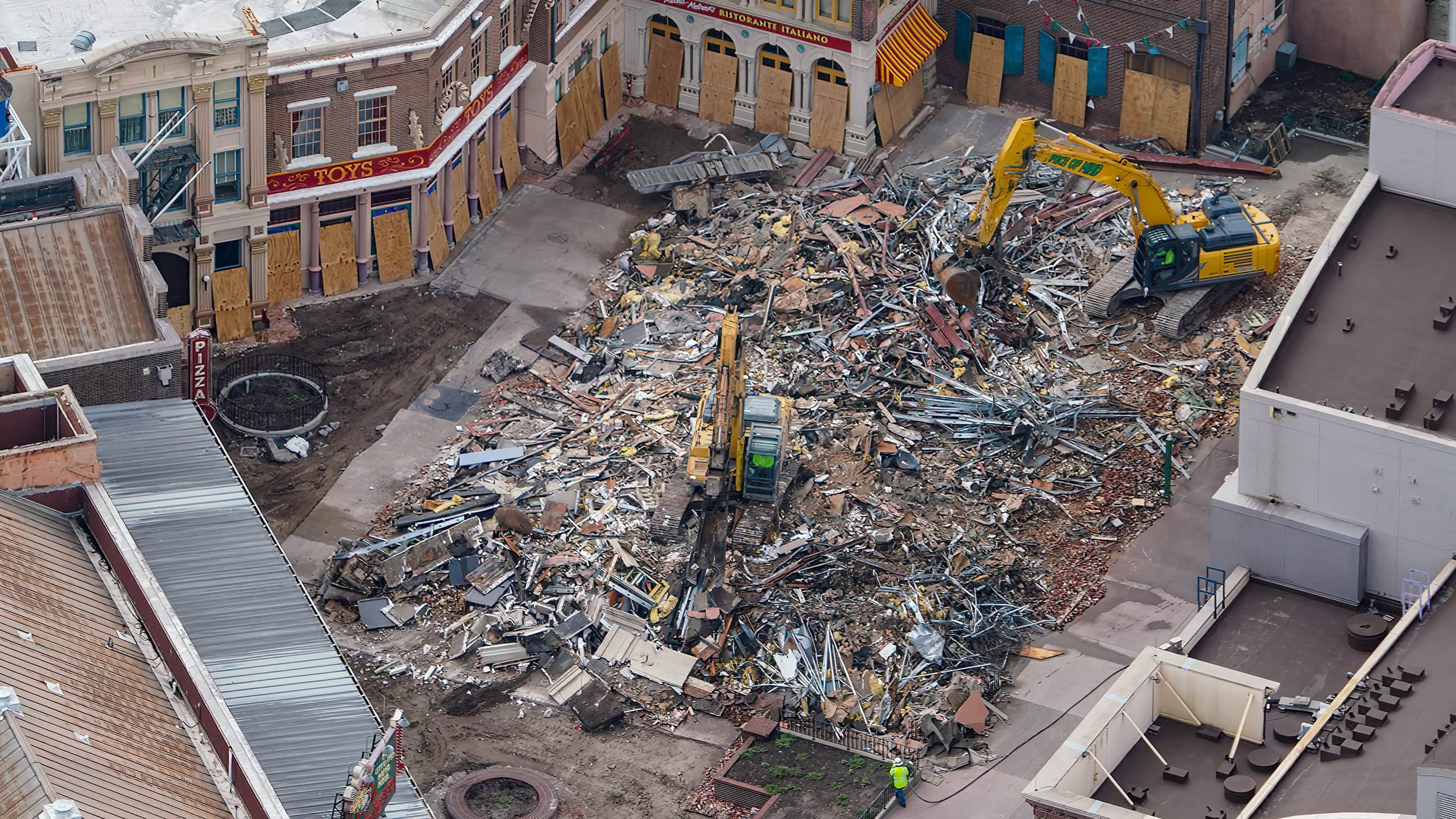 With that context out of the way, here’s a fresh look at the demolition work as seen from a helicopter hundreds of feet in the air above Disney’s Hollywood Studios. As you can see, crews knocked down the final wall this morning, and now it’s a matter of hauling off the debris.
