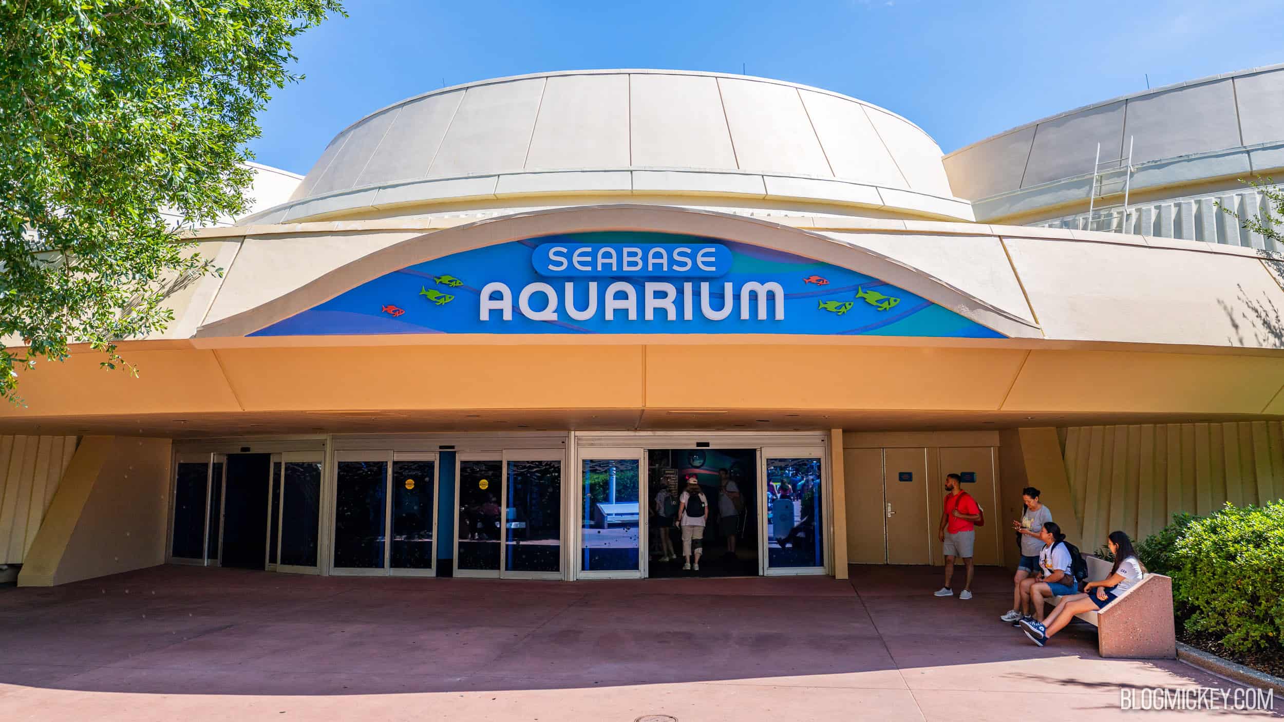The new sign says “SeaBase Aquarium”, directing guests to the indoor 5.7-million-gallon saltwater aquarium at EPCOT. There are more than 2,000 aquatic animals in the easy-to-miss aquarium. The sign also features colorful fish similar to what guests can find at the large outdoor mural for the entrance of The Seas with Nemo & Friends attraction.