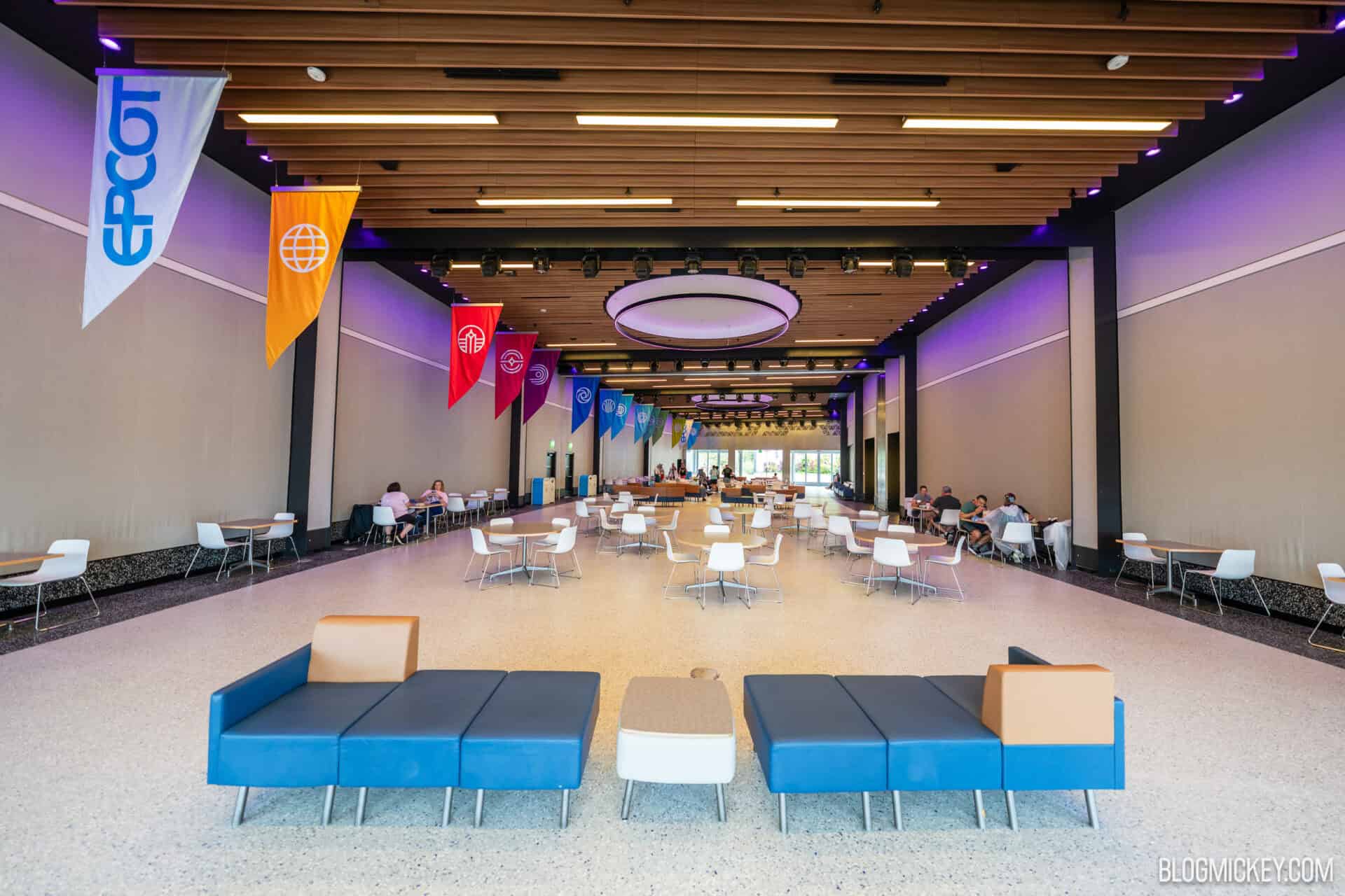 Bright, modern seating hall at Disney World with colorful banners, round tables, white chairs, and a spacious atmosphere