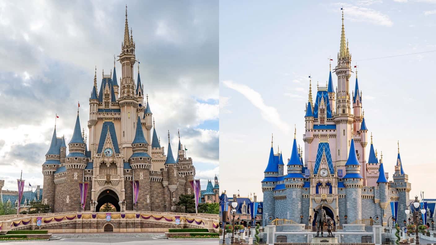 Split image of Tokyo Disneyland Cinderella Castle on the left and Walt Disney World Cinderella Castle on the right