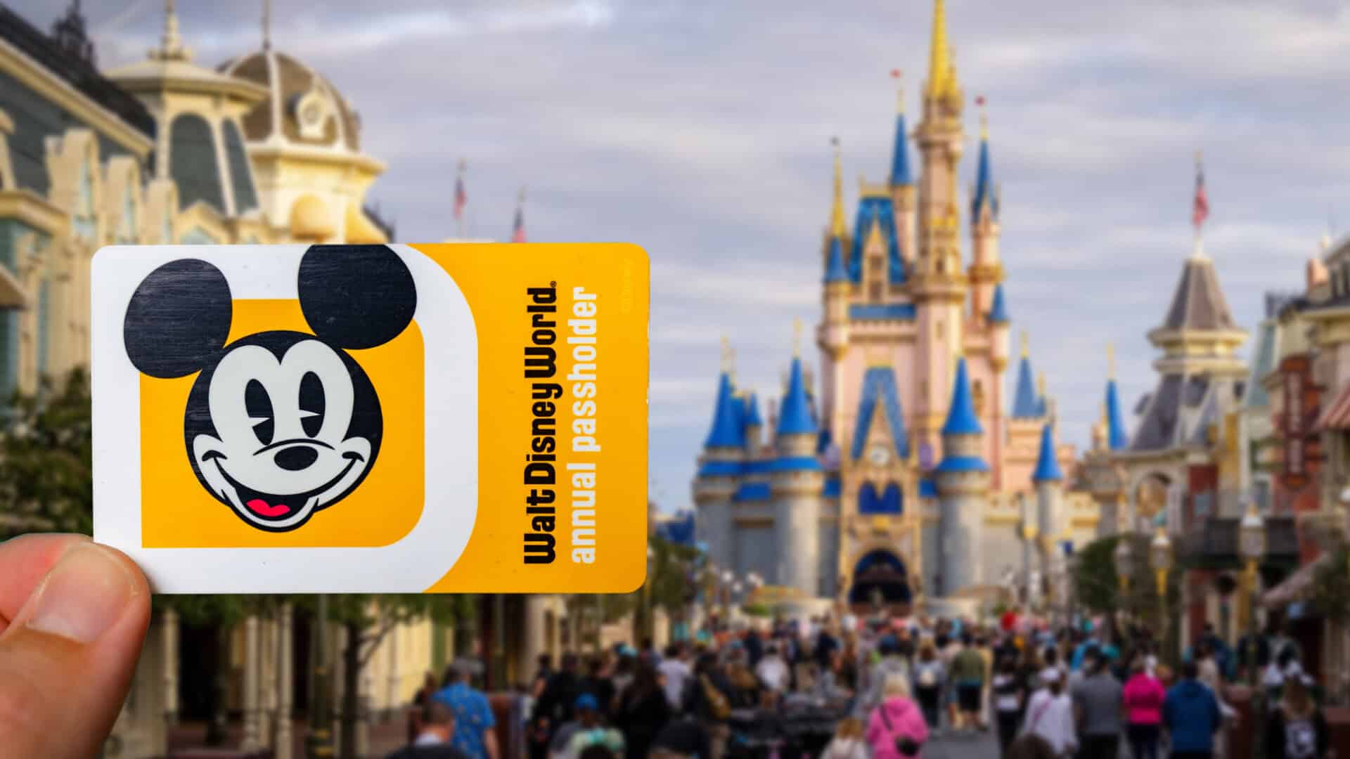 Disney Mickey Mouse annual passholder card held up in front of Cinderella Castle at Disney World.