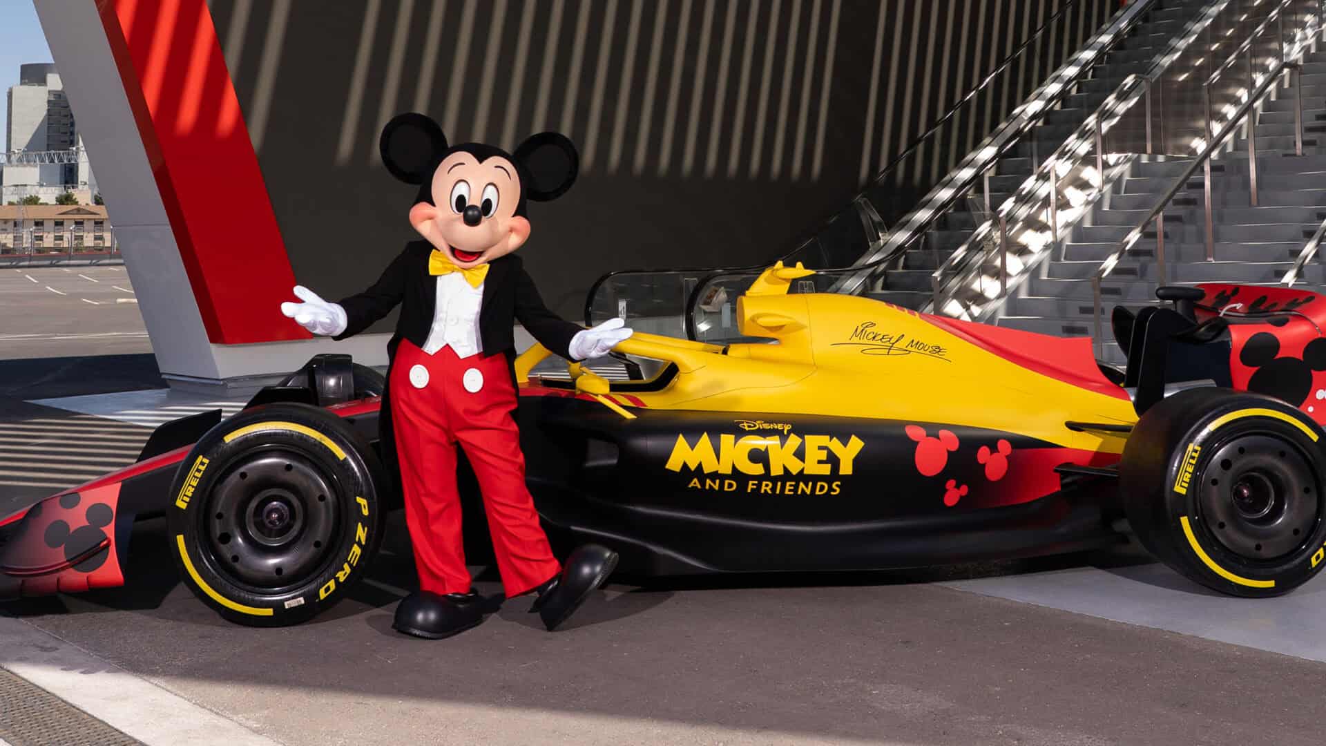 Mickey Mouse standing beside a Mickey and Friends Formula 1 car in Las Vegas