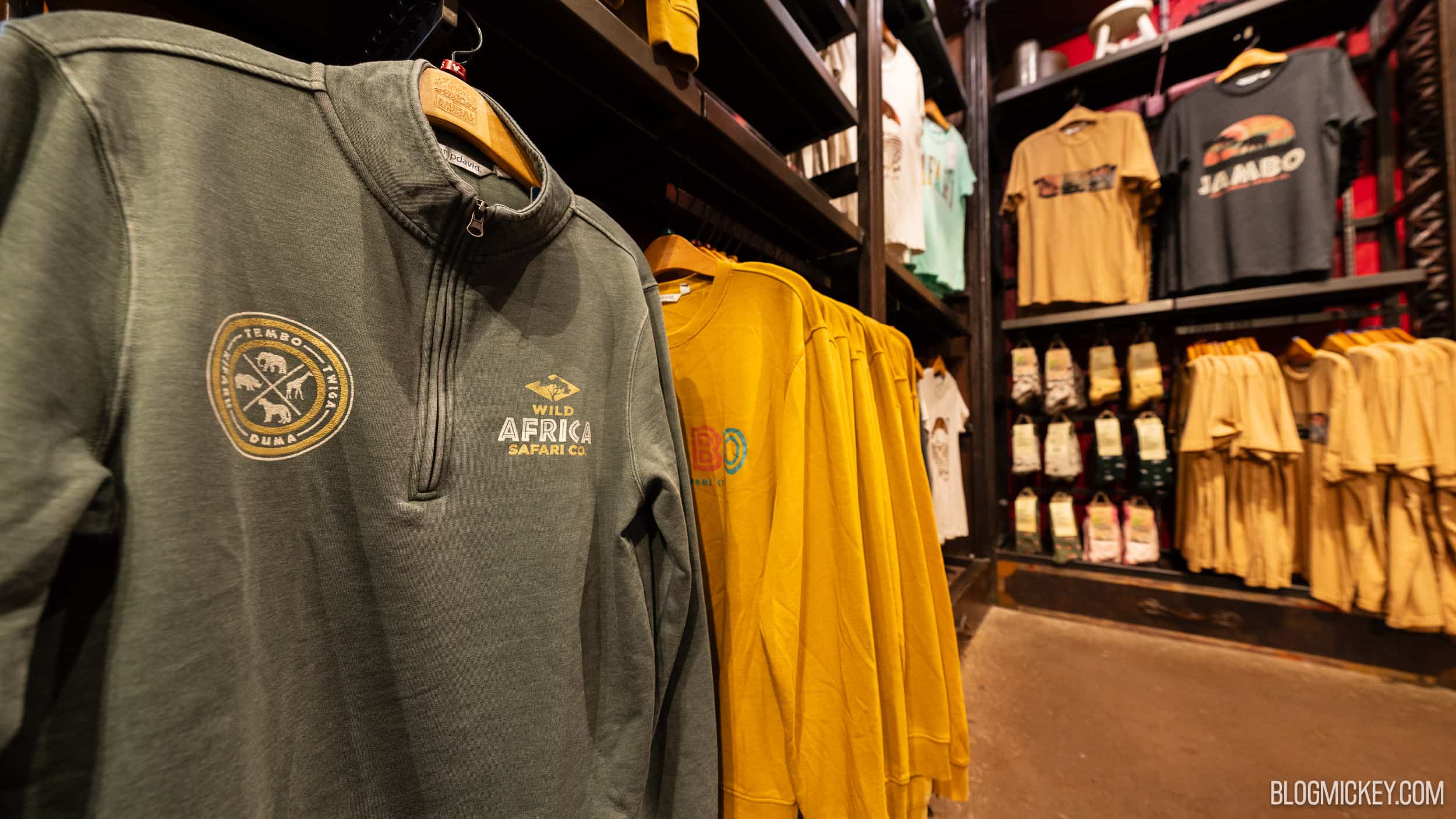 Colorful safari-themed Walt Disney World merchandise including pullovers, t-shirts, and hats arranged on metal shelves in a Disney gift shop.