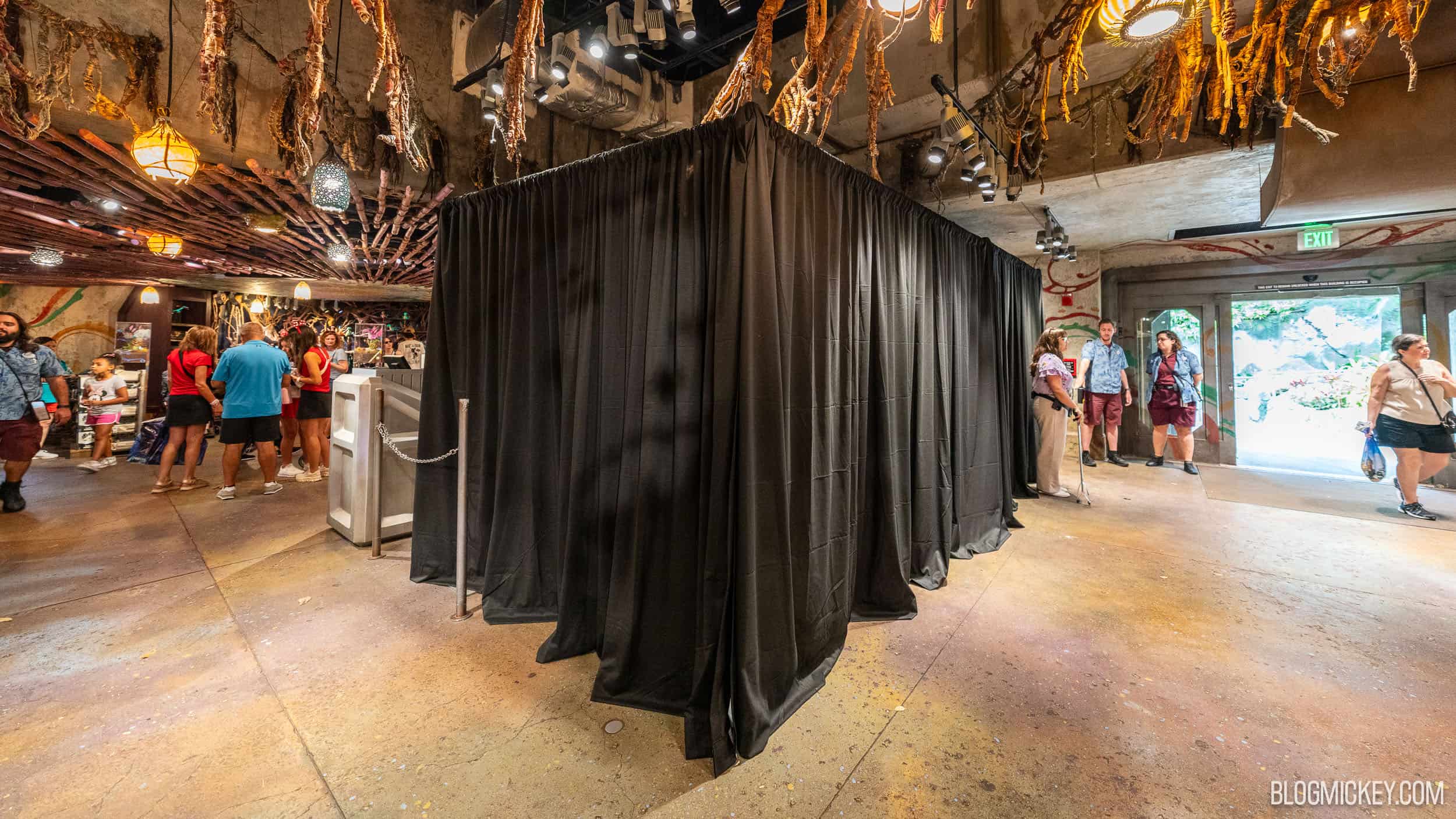 Temporary black curtain enclosure inside a themed Disney World gift shop