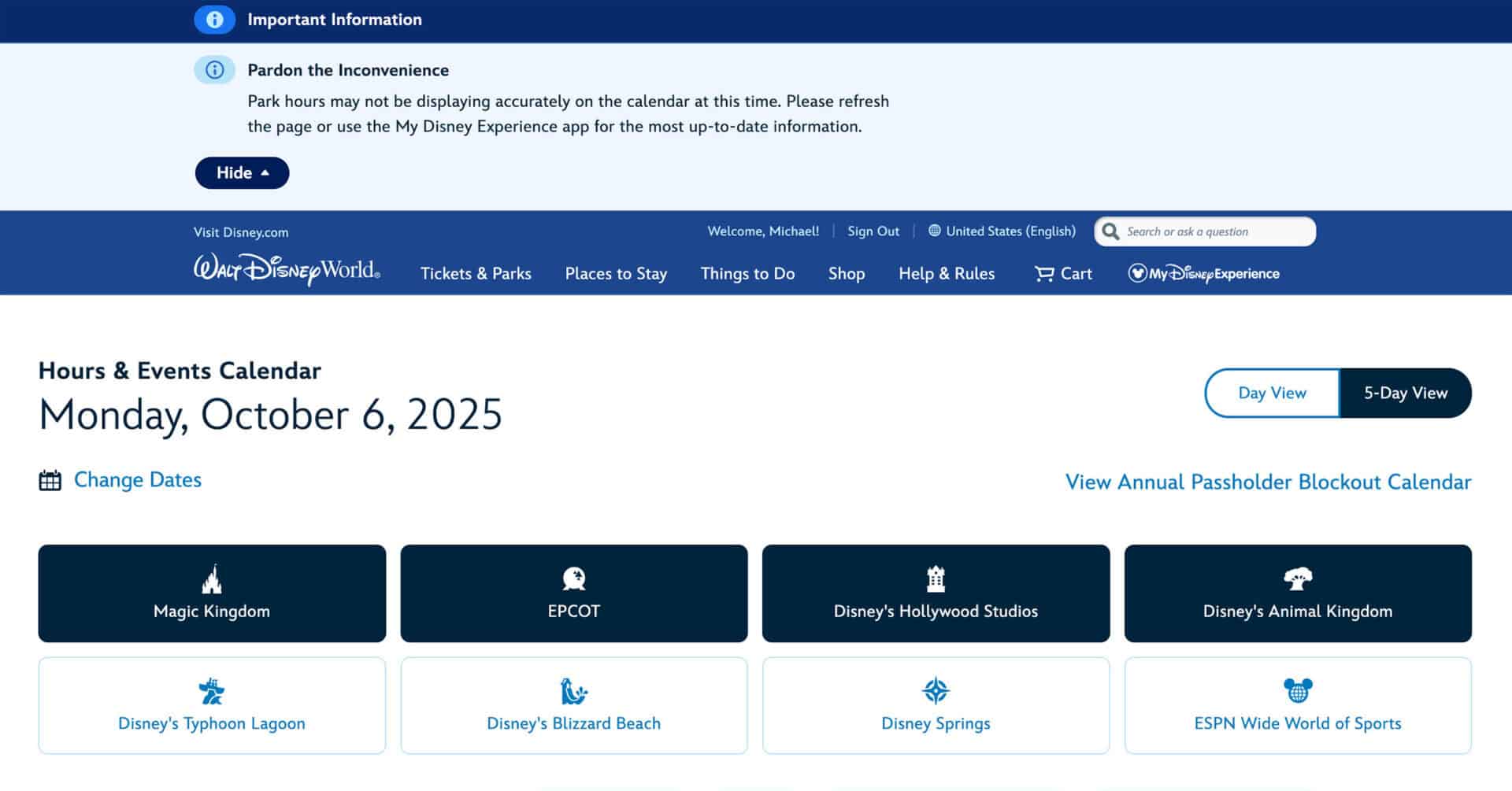 Walt Disney World Website Park Hours Issues