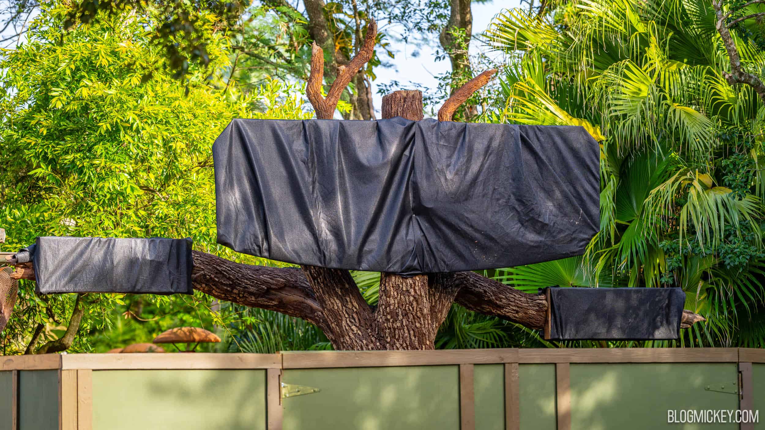 A large tree with a black tarps covering signage on its branches, surrounded by lush green foliage, a custom decorative street lamp, and a green construction fence with signs, indicating ongoing construction or decor at Disney World.