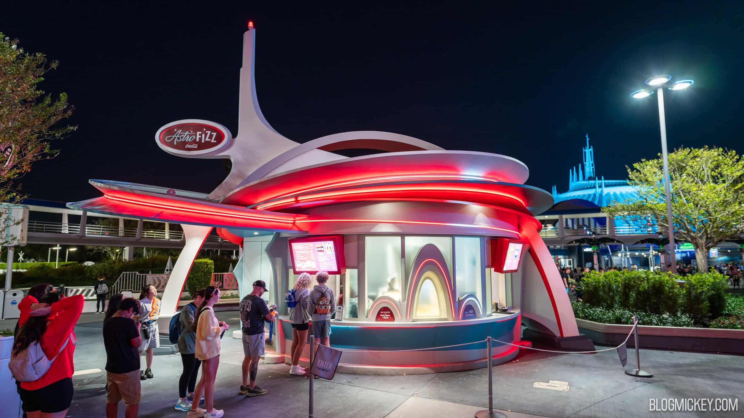 After a couple of days of soft opening, AstroFizz is now officially open in Tomorrowland at Magic Kingdom. The new snack stand replaced the former Cool Ship location. We made it out to Magic Kingdom last night to see the lighting package for AstroFizz, and to take a look at the full menu with pricing.