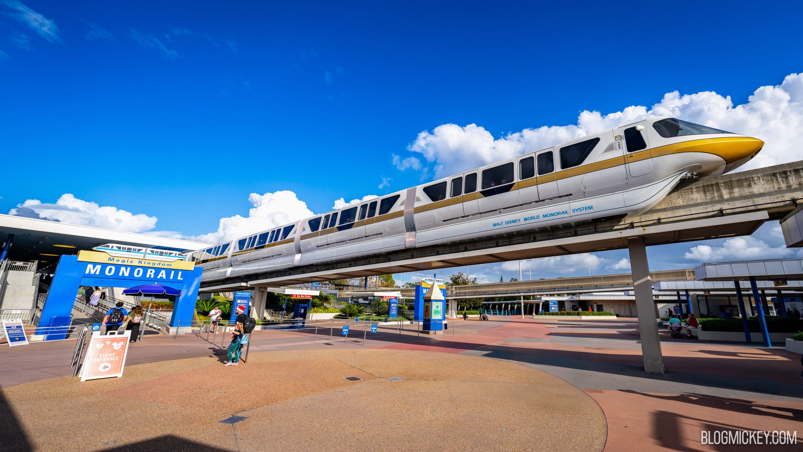 Walt Disney World monorail with a gold stripe against a white vehicle body departing the Transpoartion & Ticket Center
