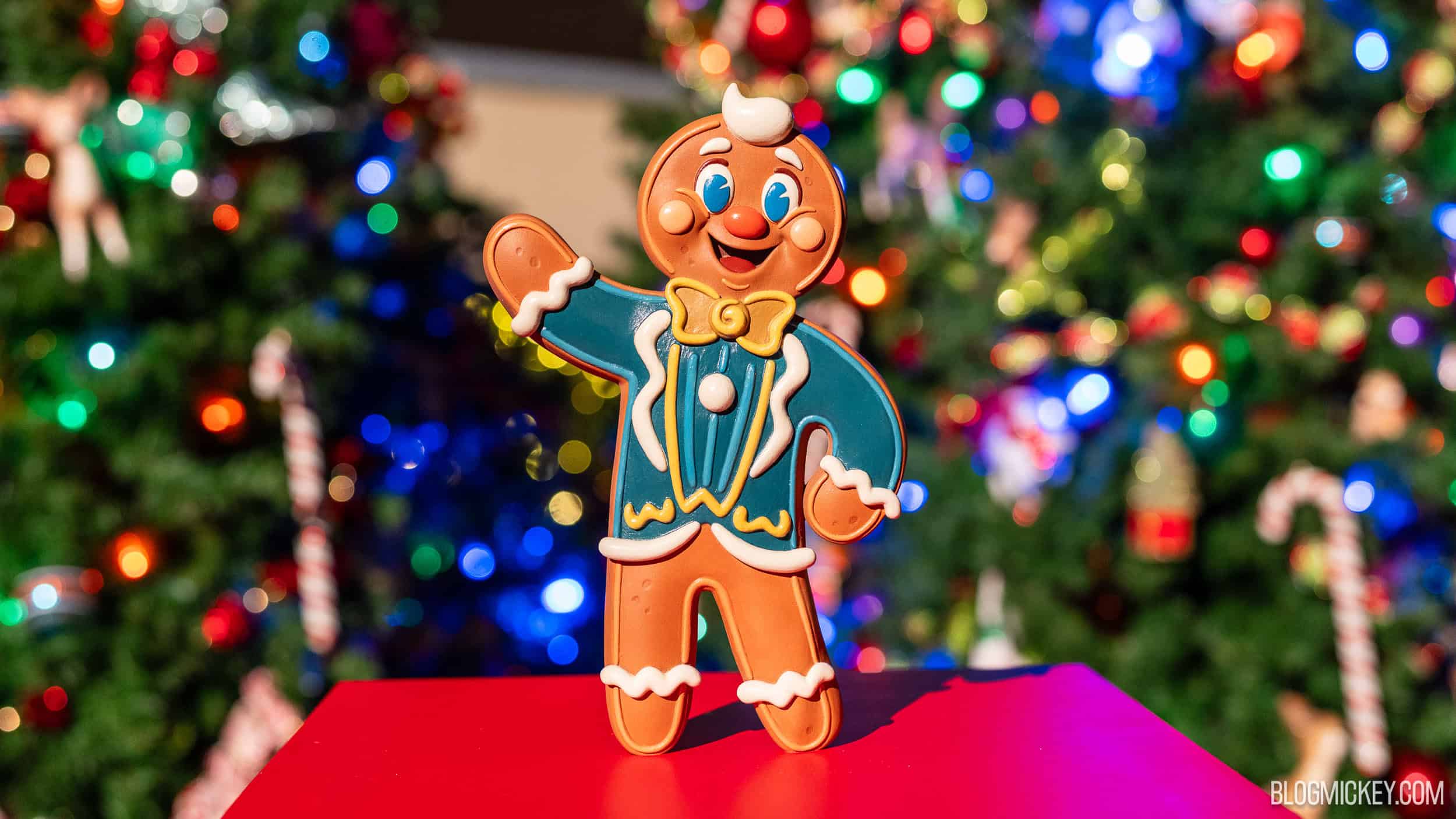 Colorful gingerbread cookie figure with Christmas decorations in the background, celebrating the holiday season at Disney.