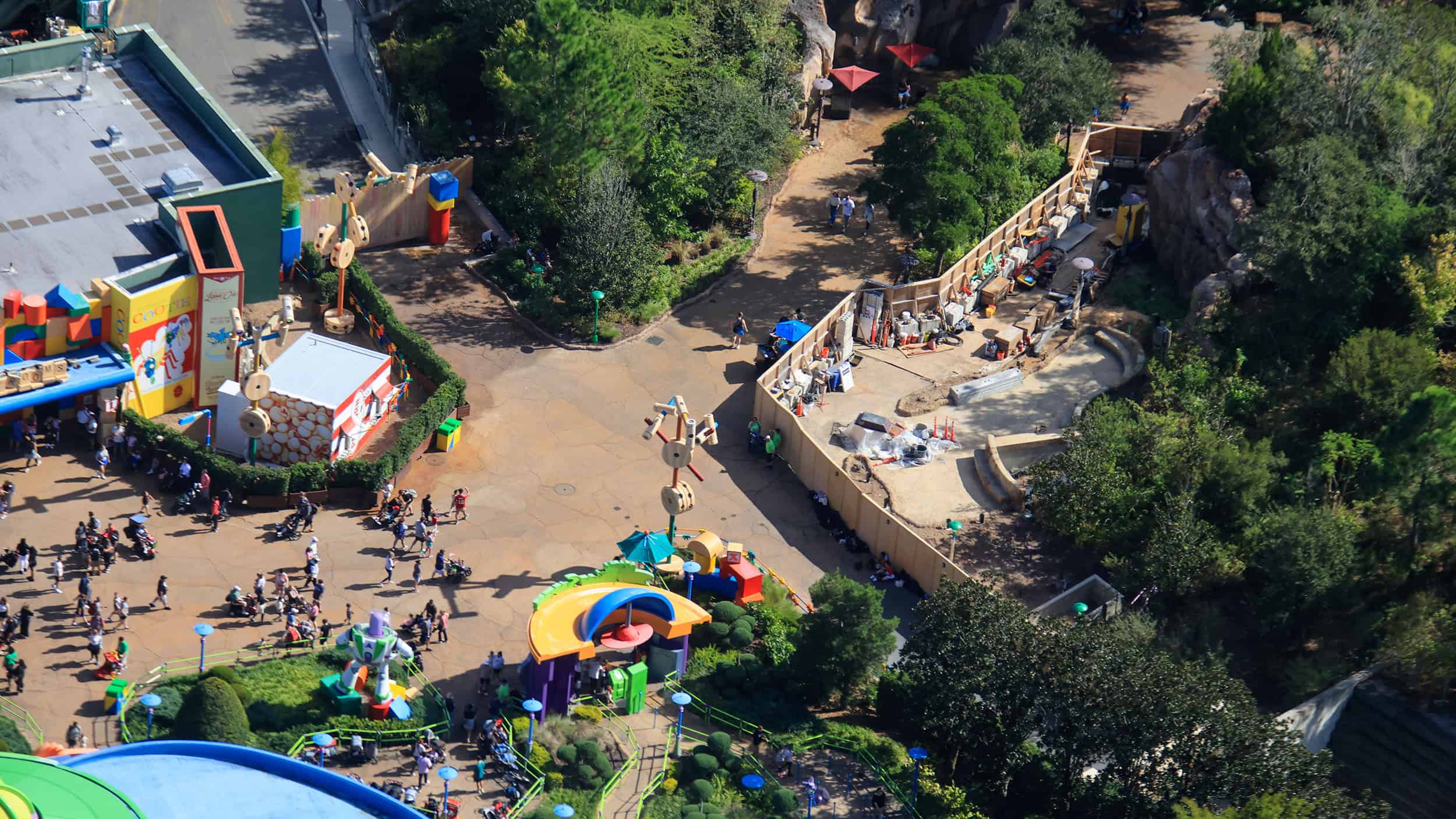 New aerial photos from friend of the site Bioreconstruct reveal that the construction is for new ledge seating. The project appeared to be related to the nearby construction of a new popcorn stand in Toy Story Land, given the timing of the arrival of construction walls this Summer. Now, we’re certain that the two projects are related. Basically, a popcorn stand in Toy Story Land, and a new seating area across the walkway to allow guests to sit and enjoy their snacks.