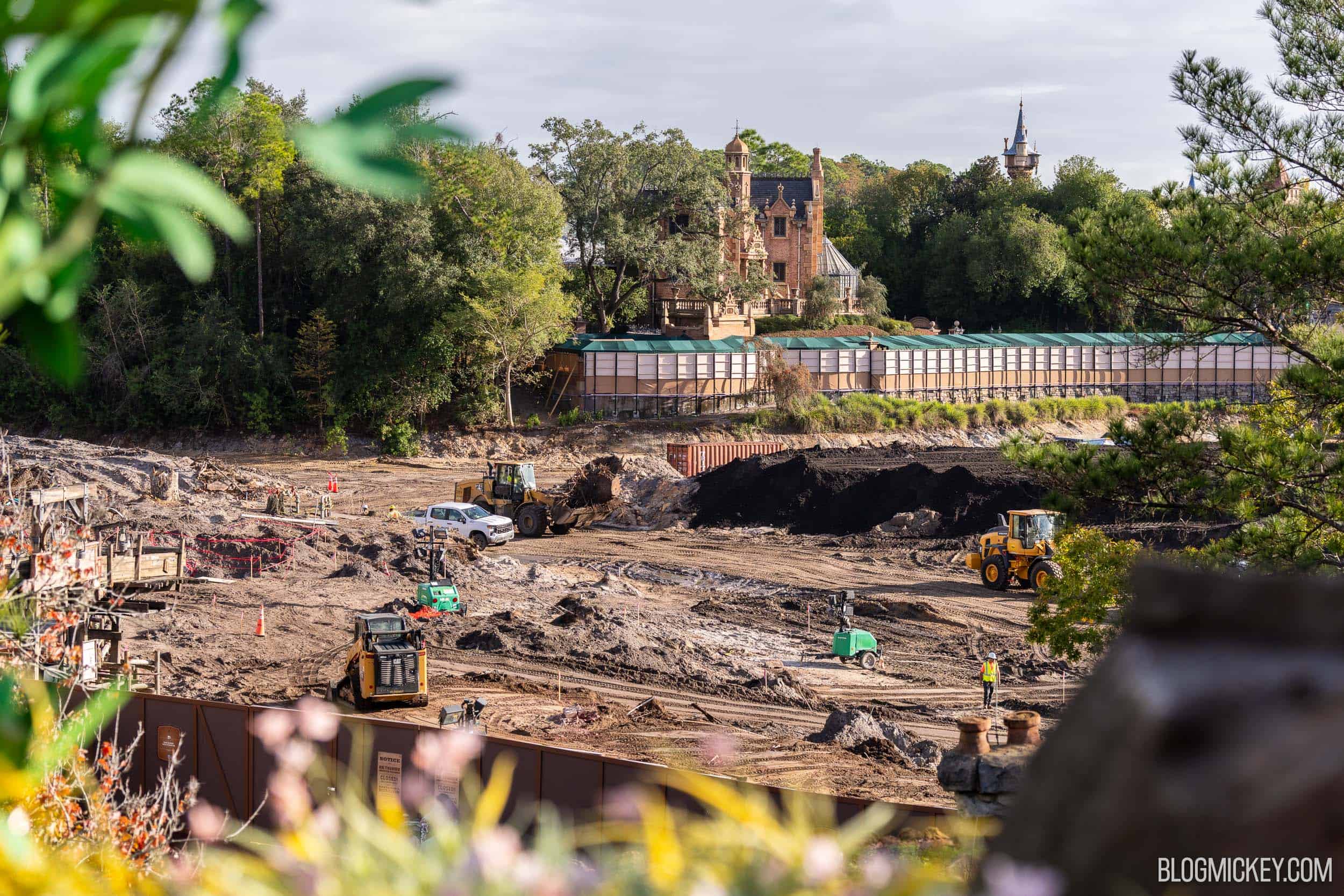 Another good vantage point for the construction is from the opposite side of the site, near the Haunted Mansion. This provides a “reverse view” of the construction site. From this side of the site, it is easier to see the remaining elevation change between the former Rivers of America basin and Tom Sawyer Island.