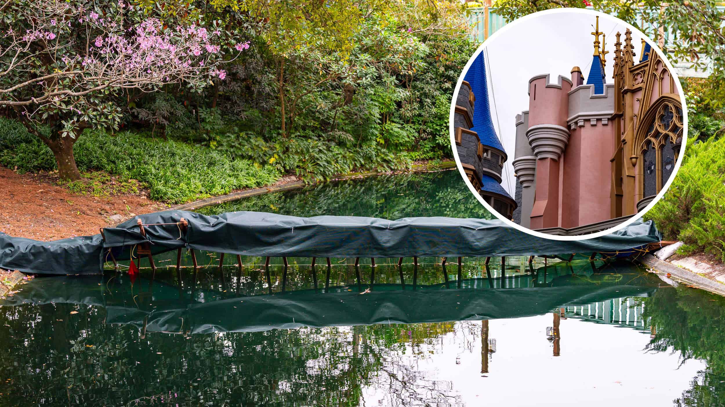 Cinderella Castle moat drained with pink flowering trees and lush greenery, prepping for restoration.