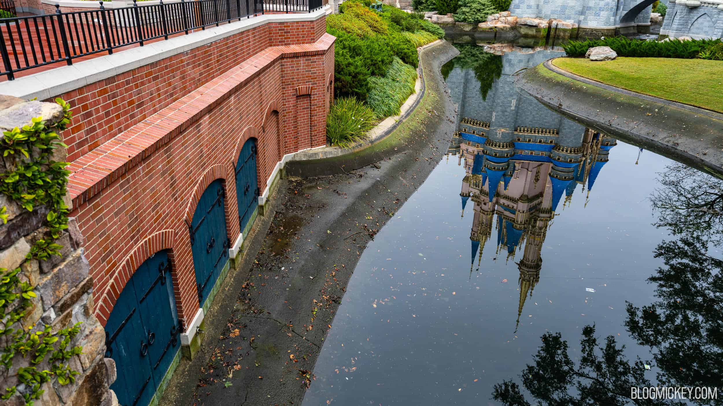 View of the castle moat being drained at Magic Kingdom with surrounding greenery.