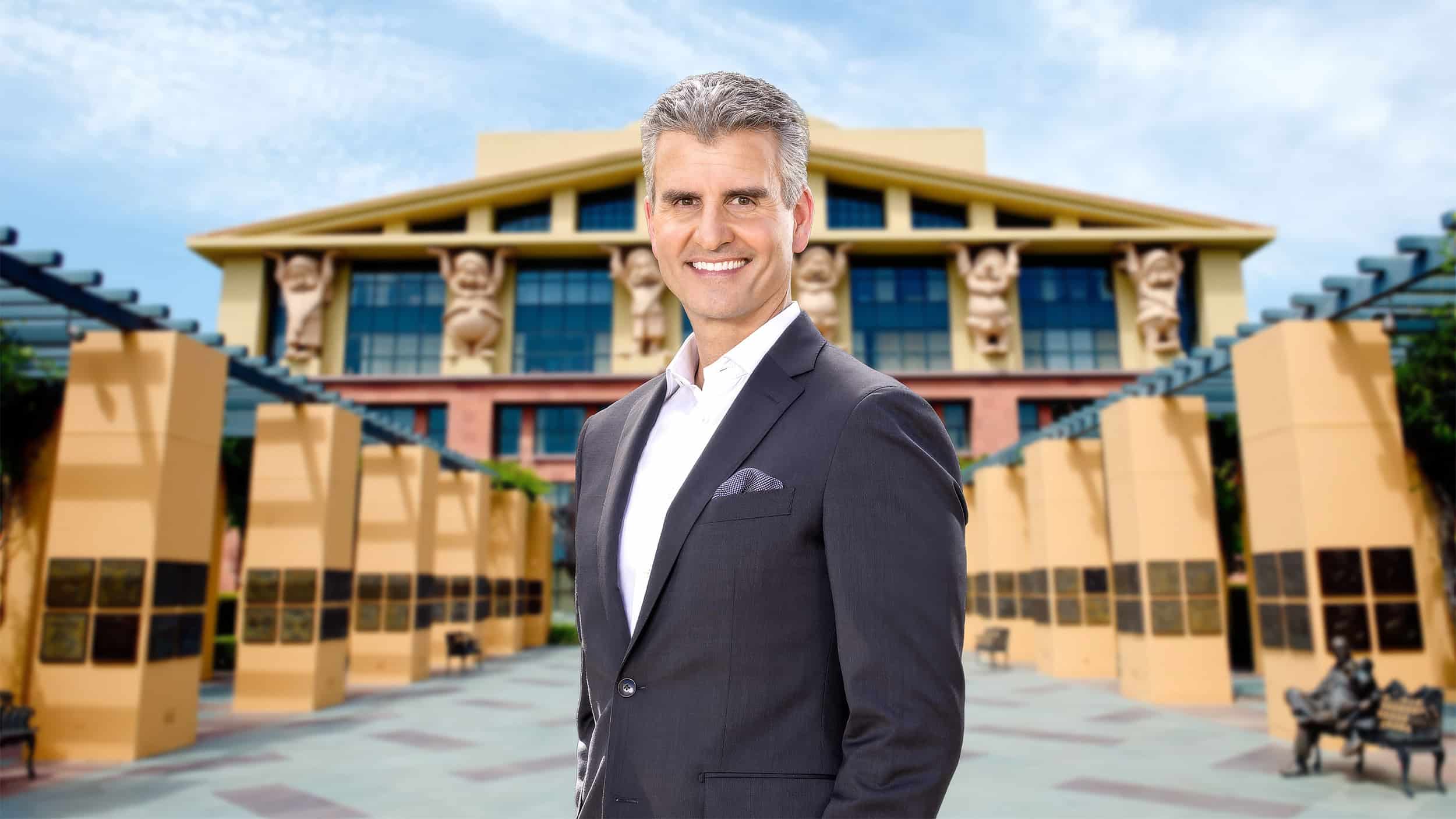 Smiling man in suit standing in front of Disney resort entrance with themed architecture.